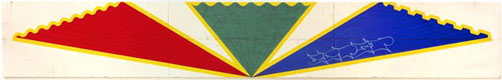 I was travelling to ruins outside of Mexico City, and I saw this very large wall that had a painting on it. There was no commercial message, which was intriguing to me because there is so much advertising down there. The image struck me because it was sort of like sun rays coming from a central point, and it just had a great appeal to me. I thought about it and eventually photographed it. I wanted to paint my version of that image. I liked the anonymity and urban-guerilla feeling to it. It just seemed to me like someone had painted this thing on the side of a wall and left it. That was enough to intrigue me. I just reproduced the image in my painting, and then I did another version of it that implied some kind of decline to the imagery. The banners begin to sag over upon themselves in Azteca in Decline. That was the whole story. Somehow the imagery reminded me of Montezuma or the Aztec civilization.