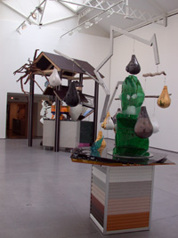 At Yvon Lambert, Jeppe Hein led us down a path of disorientation, constructing a mirrored labyrinth that, like Martin, dissolved the expected grid of planes. The work of Danish-born, German-based Hein borrows the formal singularity and precision of Minimalism, but in what has been aptly deemed "interventions," Hein inserts a forced and often playful interaction between viewer and object. In the monologue Until Now, Francesco Bonami eschews the term "interactive artist" in describing Hein's work because "interactive art never works, and Jeppe Hein's projects usually work quite well." Hein is able to follow a delicate path making work that engages the space and viewers around it, while maintaining a consistent dialog with Minimalism and formal white cube considerations.