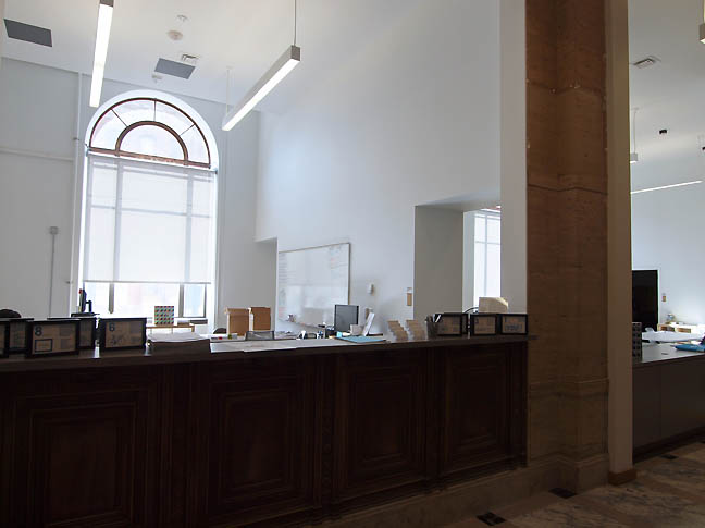 PNCA's admissions department with original Post Office's main desk contrasted with the Irwin-like windows